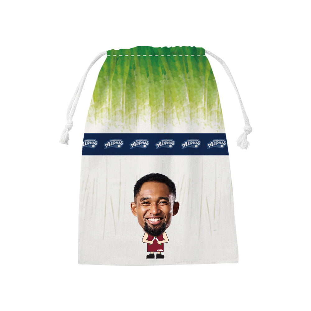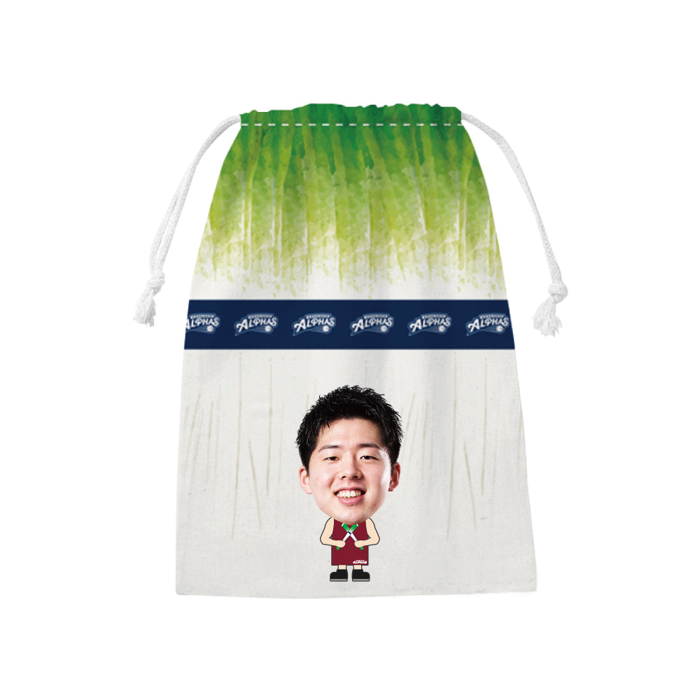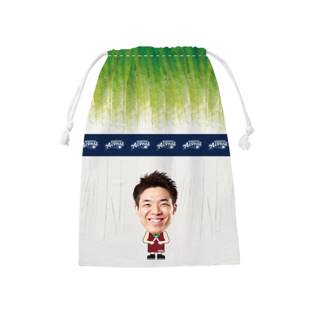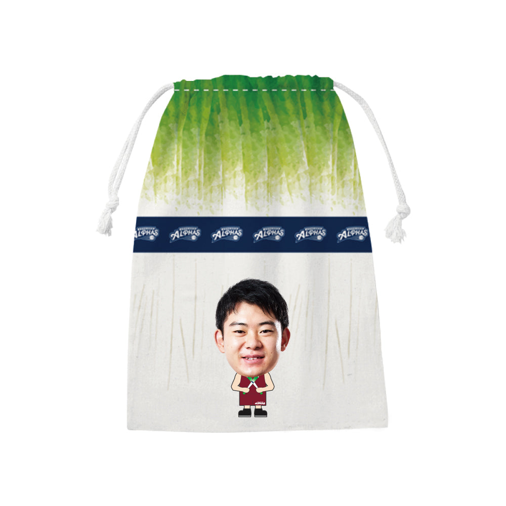 越谷アルファーズ所属選手がプリントされたネギデザインの巾着が受注商品で登場!