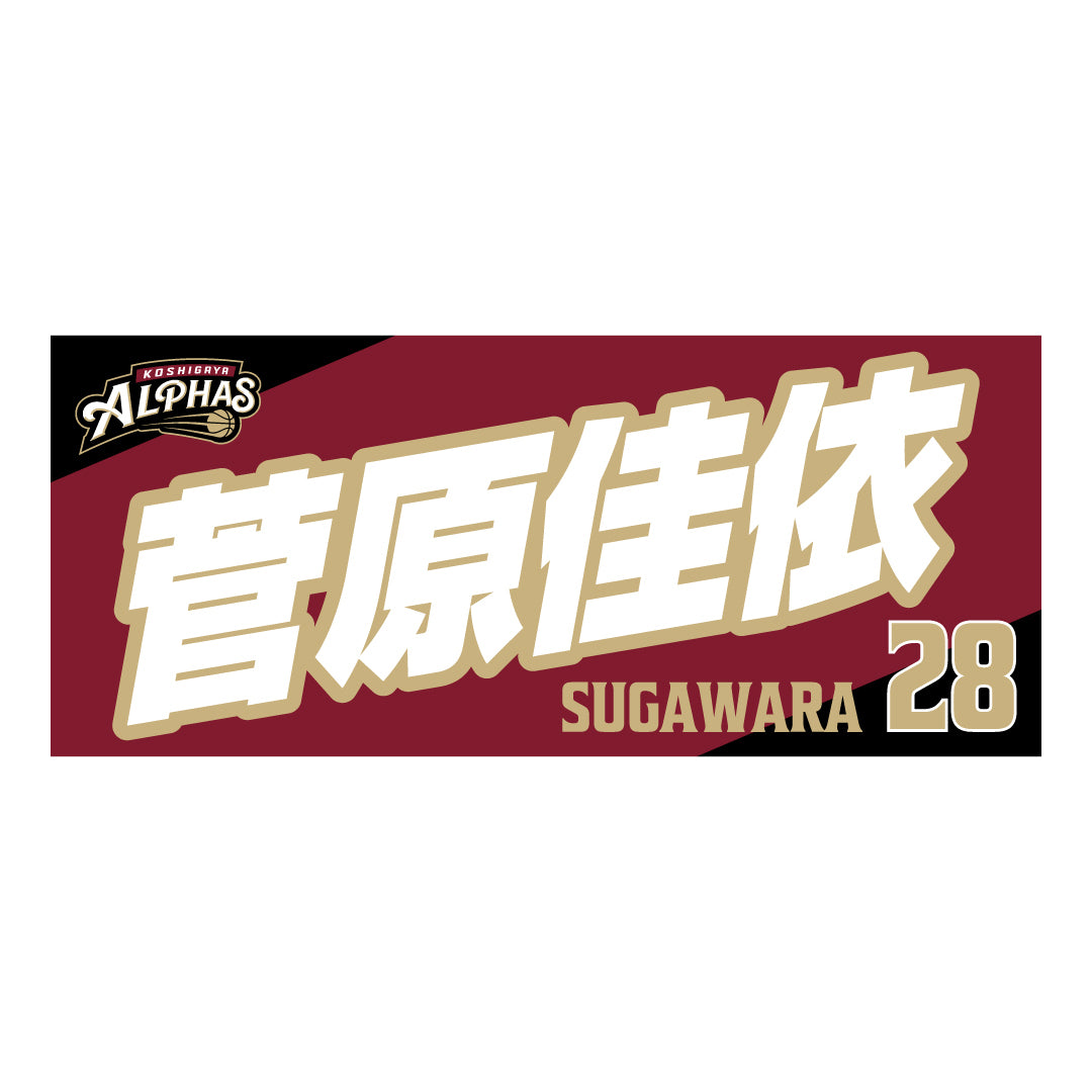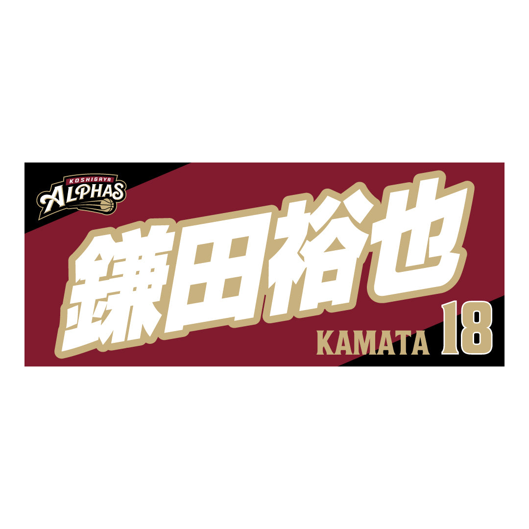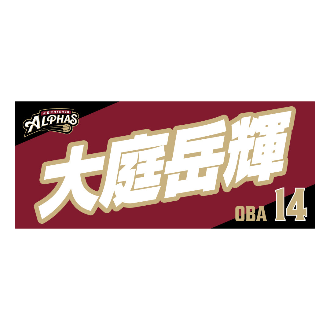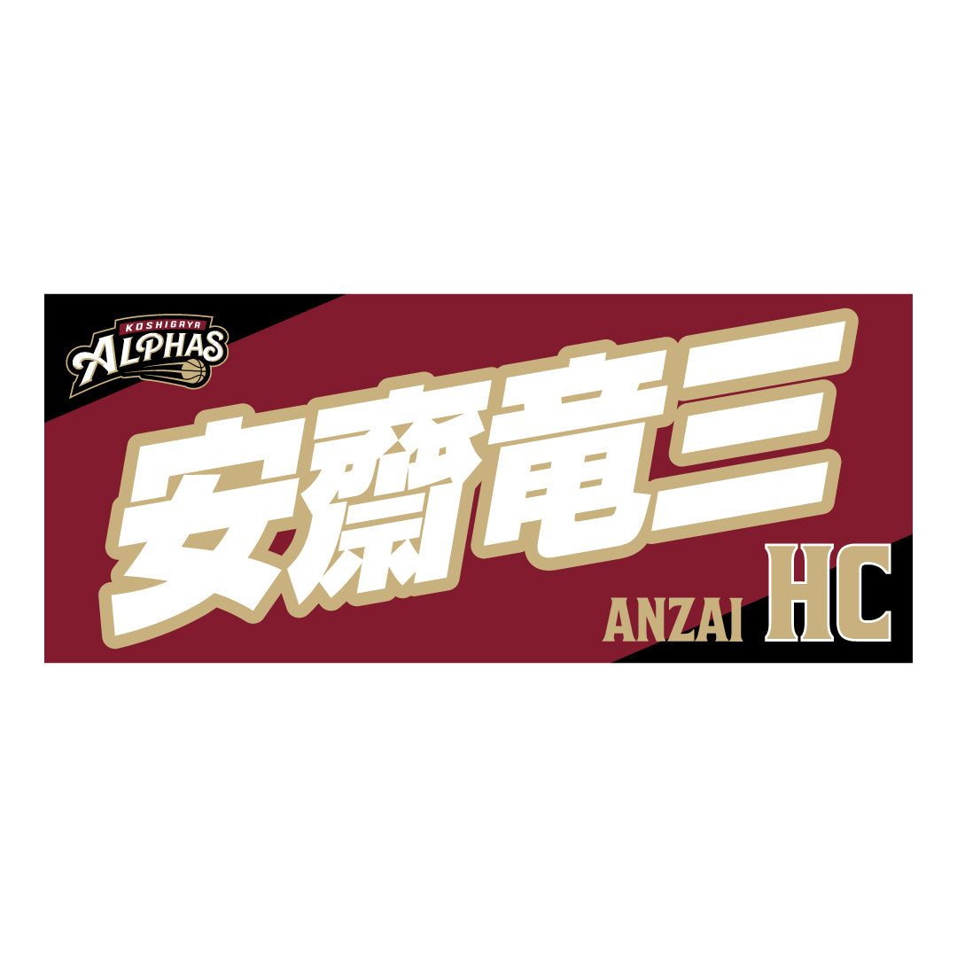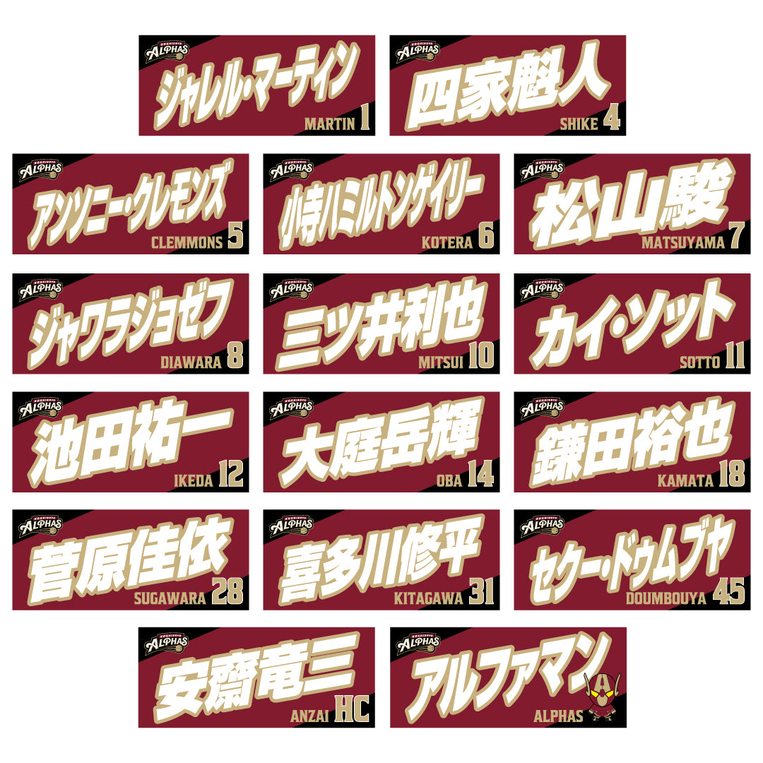 2025-26シーズンの越谷アルファーズ所属選手およびHC、マスコットのナンバーとネームをプリントしたスポーツタオル。