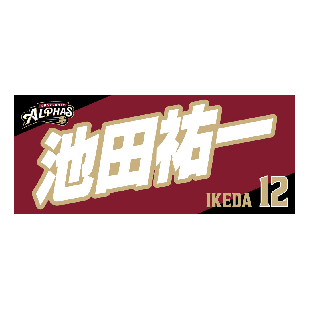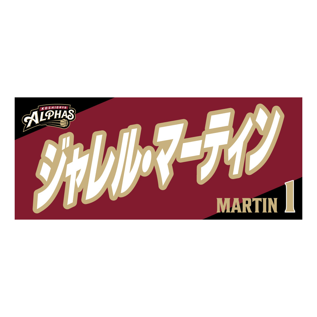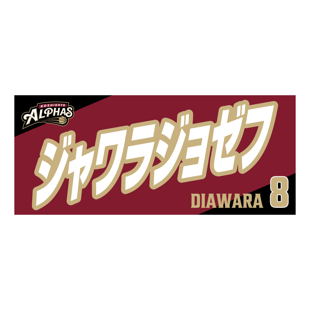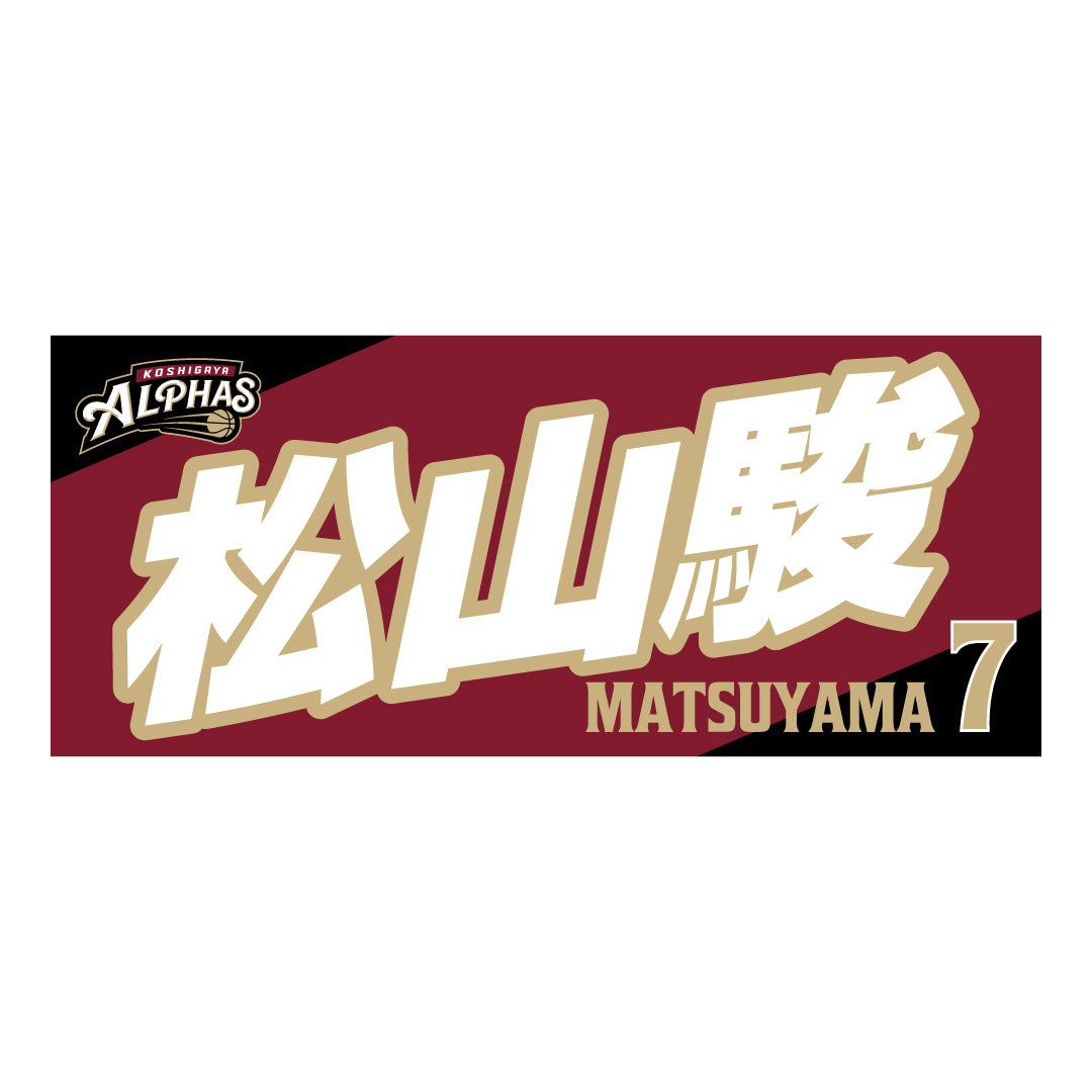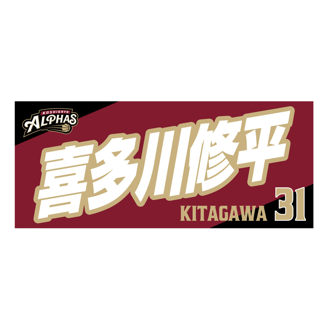 2025-26シーズンの越谷アルファーズ所属選手およびHC、マスコットのナンバーとネームをプリントしたスポーツタオル。